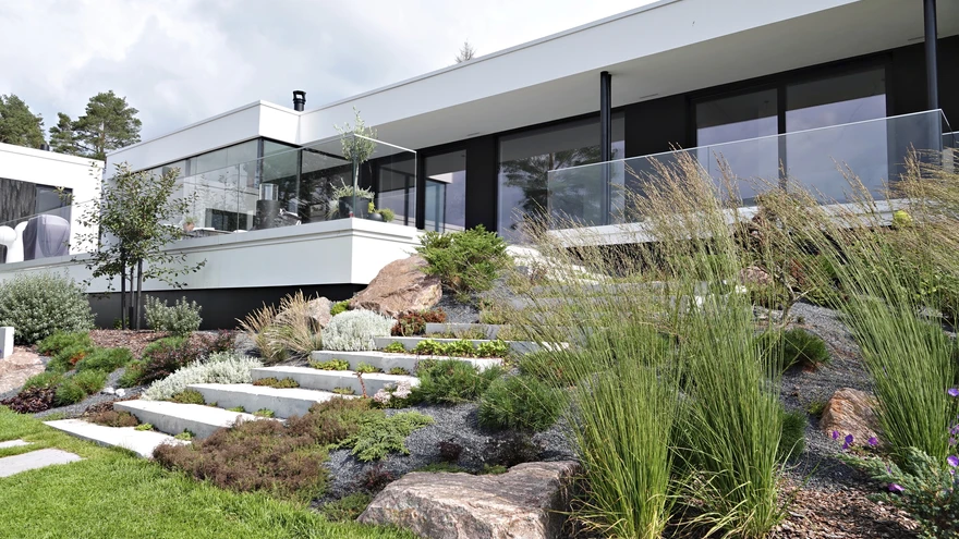 | foto: Paula Ritanen-NärhiLoviisa elamumessi soosituima objekti õuenõlvad laskuvad looduslikult mereranna suunas. Modernse maja hästihooldatud õu muutub pisitasa mererannaks.