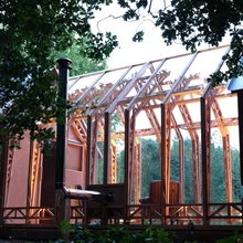 Kuusest puitkarkass ja klaas on selle aiamaja (mõnes olukorras pigem paviljoni) põhimaterjal. Üksteise seest, nagu sahtel, saab rööbastel välja libistada näiteks kaks eraldiseisvat, avatud seintega varjualust, mille vahel kaminaga terrass, või moodustada maja keskmisest osast klaasseinte ja -lagedega talveaia või siis täiesti kokkupandult jätta hoonest mulje kui täiesti tavalisest suvemajast.